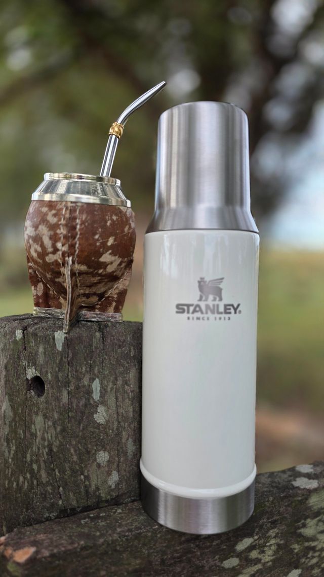 El conjunto incluye un termo Stanley de acero inoxidable, reconocido por su capacidad para conservar la temperatura del agua durante horas. Su diseño resistente y confiable lo convierte en uno de los termos más elegidos para acompañar largas rondas de mate.