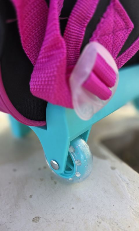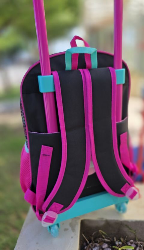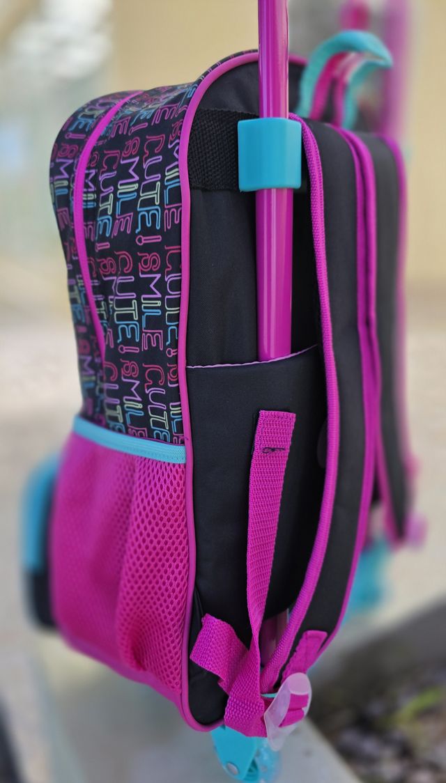 Su frente presenta un estampado vibrante de Minnie con detalles brillantes y colores alegres que la hacen destacar. Incorpora carrito con manija retráctil y ruedas resistentes que facilitan el traslado sin necesidad de cargar peso en la espalda.