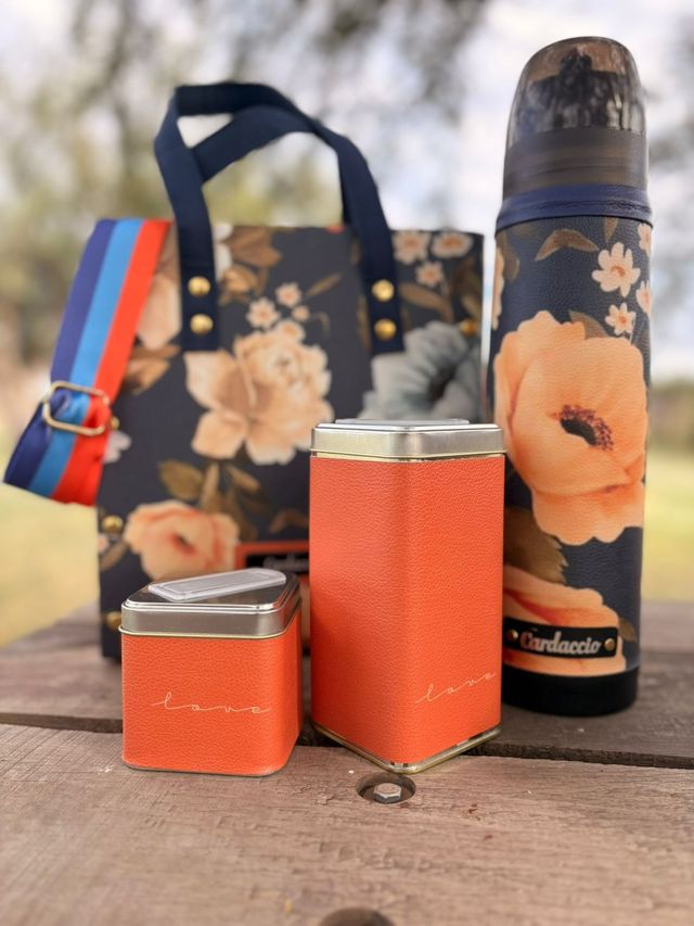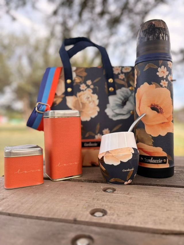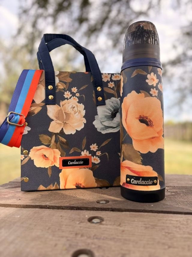 El combo incluye una matera rígida con diseño floral y correa regulable, práctica para transportar el termo, la yerba y los accesorios de manera cómoda y organizada.