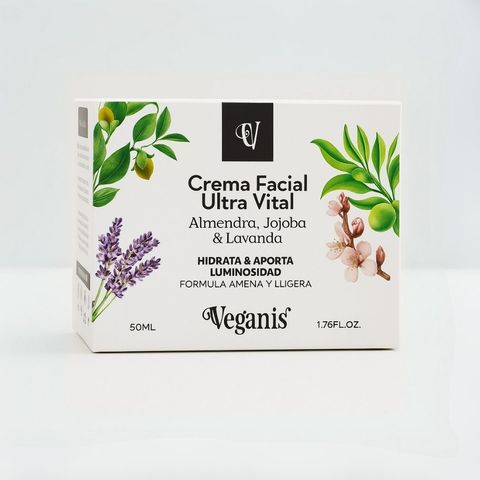 Ayuda a controlar la producción de sebo, minimizar poros y calmar la piel. Aporta frescura inmediata, reduce rojeces y protege frente a los radicales libres. - Crema Facial Ultra Vital con Almendra, Jojoba y Lavanda