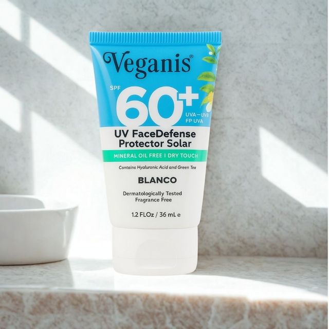 Textura ligera y de rápida absorción. Hidrata, aporta luminosidad y acompaña tratamientos para pieles sensibles y con tendencia a brotes, brindando efecto calmante y reparador. - Protector Solar Veganis UV FaceDefense SPF 60+